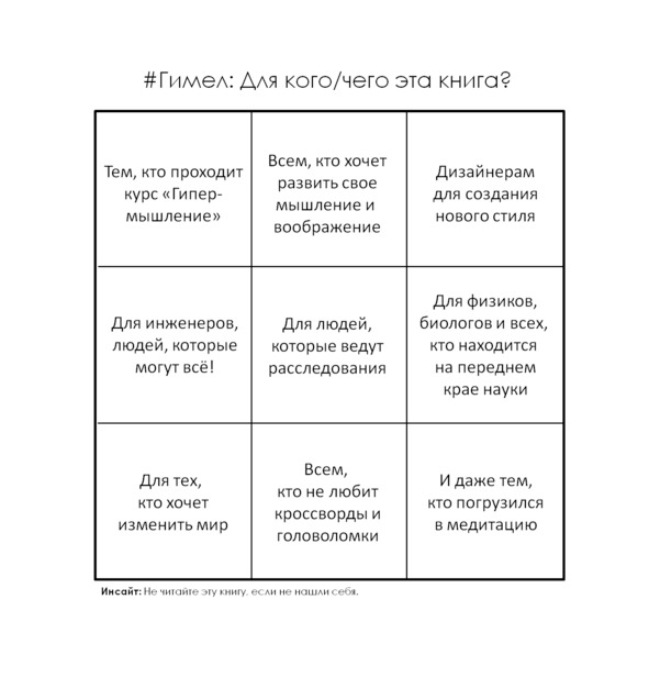 Режим «книга» предполагает, что вы познакомитесь во всеми приемами Гипермышления в одной книге и попробуете их, как некоторый набор инструментов, которые позволяют работать на границе логики и воображения.