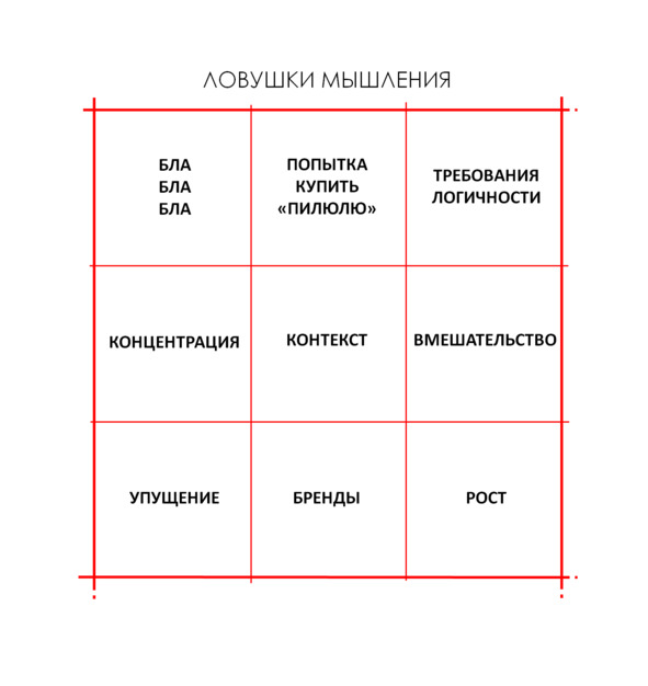 Попытка срезать угол, обмануть природу и вмешаться (химическое или физическое воздействие) напрямую в работу ума, чревато потерей контроля над результатами мышления. Интересный феномен, который я причисляю к ловушкам — это бренды. Вера в их силу порой выше, чем вера в собственные силы и дает надежду на то, что решения есть, его достаточно купить. Рост результатов, в освоении метода могут вызвать у вас чувство собственной гордости. Вы почувствуете себя достаточно умным и ваше продвижение на этом остановится. Возвращайтесь к этой матрице «Ловушки мышления» и фиксируйте моменты, когда вы попадали в ту или иную ловушку.