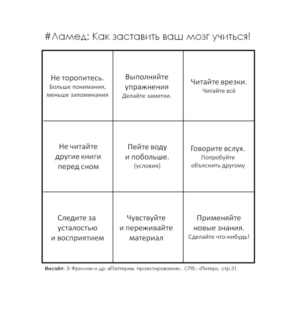 Помимо того, что «не_делать», хочу поделиться идеями, которые удалось найти в книге «Паттерны проектирования», на тему: «Как заставить мозг учиться?». Каждый из элементов этой матрицы дает возможность сделать что-то конкретное в процессе обучения. Очень хотелось, поменять несколько элементов в этой матрице, но я решил оставить ее в книжной редакции, чтобы вы могли сами ее улучшить.