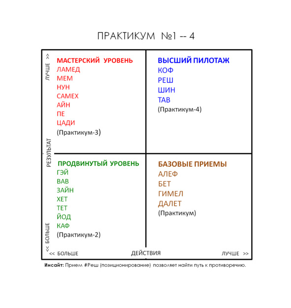 Ламед — прием позволяющий использовать матрицу для того, чтобы описать технологию достижения результата. Таким образом формат записи «3х3» помогает зафиксировать свои знания, сохранять для бизнеса и передавать их в процессе обучения. По этому приему вышла отдельная книга «Технология», бета-версия.