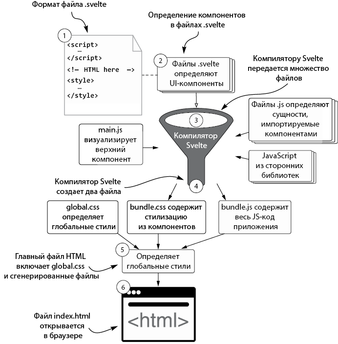 На рис. 1.1 показана роль компилятора Svelte. Компоненты пользовательского интерфейса реализуются в файлах .svelte. Они могут содержать код JavaScript (в элементе script), CSS (в элементе style) и HTML для визуализации.