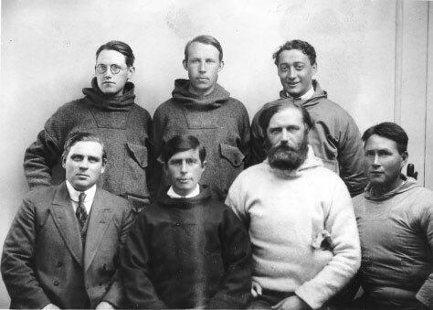 Участники экспедиции в гренландском Нууке. Слева направо: Кай Биркет-Смит, Тёркель Матиассен, Хельге Бангстед (стоят), Педер М. Педерсен, Кнуд Расмуссен, Петер Фрейхен, Якоб Ольсен (сидят). Фото: Архив Кнуда Расмуссена