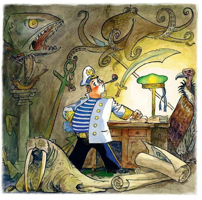 Вместо скромного отставного аптекаря за столом, углубившись в чтение какой-то древней книги, сидел грозный капитан в полной парадной форме, с золотыми нашивками на рукавах. Он свирепо грыз огромную прокуренную трубку, о пенсне и помину не было, а седые растрёпанные волосы клочьями торчали во все стороны. Даже нос, хотя он действительно и покраснел, стал у Врунгеля как-то солиднее и всеми своими движениями выражал решительность и отвагу.