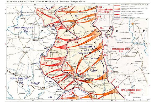 Второго февраля 1943 года была начата операция с целью освобождения Харькова. Наступали с успехом 69 общевойсковая, 3 танковая армии. Третьего февраля вступила в битву 40 армия. Ее командарм Москаленко позднее вспоминал, что противник ожесточенно сопротивлялся, приспособил населенные пункты к обороне, произвел подрывы мостов, заминировал и повредил дороги. Крепкие морозы, метели, многочисленные снежные заносы и небольшое число дорог создавали значительные препятствия для маневрирования и снабжения советских войск, которые, преодолевая сопротивление, продолжали наступать[18].