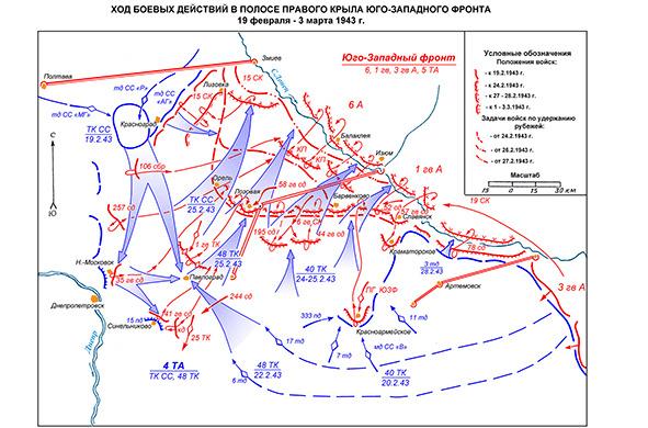 19 февраля дивизии Юго-Западного фронта без достаточных резервов наступали по 3 направлениям: Красноград, Запорожье, Красноармейское. Танковые корпуса с 11 февраля с большими потерями отбивали атаки гитлеровских танковых дивизий у Красноармейского.