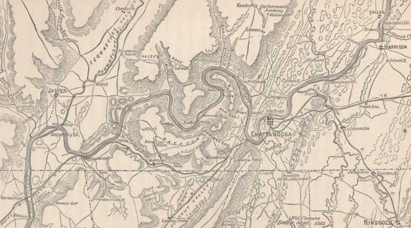 Chattanooga is on the south bank of the Tennessee, where that river runs nearly due west. It is at the northern end of a valley five or six miles in width, through which Chattanooga Creek runs. To the east of the valley is Missionary Ridge, rising from five to eight hundred feet above the creek and terminating somewhat abruptly a half mile or more before reaching the Tennessee. On the west of the valley is Lookout Mountain, twenty-two hundred feet above-tide water. Just below the town the Tennessee makes a turn to the south and runs to the base of Lookout Mountain, leaving no level ground between the mountain and river. The Memphis and Charleston Railroad passes this point, where the mountain stands nearly perpendicular. East of Missionary Ridge flows the South Chickamauga River; west of Lookout Mountain is Lookout Creek; and west of that, Raccoon Mountains. Lookout Mountain, at its northern end, rises almost perpendicularly for some distance, then breaks off in a gentle slope of cultivated fields to near the summit, where it ends in a palisade thirty or more feet in height. On the gently sloping ground, between the upper and lower palisades, there is a single farmhouse, which is reached by a wagon-road from the valley east.