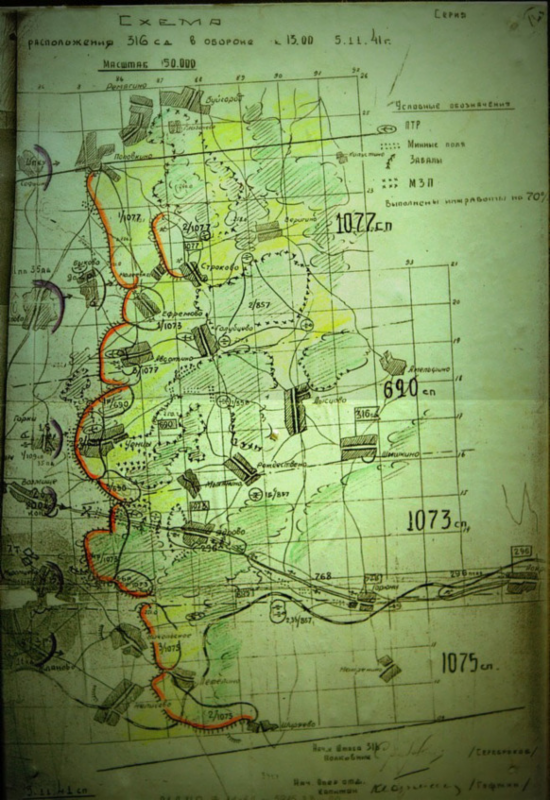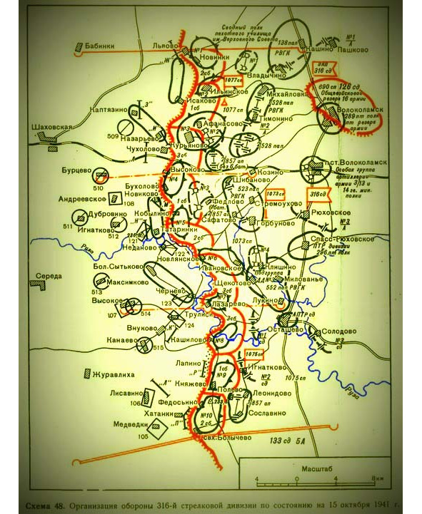 316 сд Волоколамский участок Можайской ЛО (линии обороны) обороняли: 302 пульбат (пулеметный батальон), пехотное училище им. Верховного Совета, 488 и 584 ап пто (пушечные артполки противотанковой обороны), батальон 108 сп, 41озад (отдельный зенитный артиллерийский дивизион), дивизион Московского арт. училища, 41 и 42 огнеметные роты, танковая рота. Не обладая боевым опытом, дивизия была усилена двумя артиллерийскими полками и танковой ротой, и таким образом, располагала мощной артиллерией: с приданными дивизии средствами в наличии было 207 орудий, из них: 25-мм — 4; 45-мм — 32; 76-мм полковых пушек — 14; 76-мм дивизионных пушек — 79; 85-мм — 16; 122-мм гаубиц — 8; 122-мм пушек — 24 и 152-мм пушек — 30.