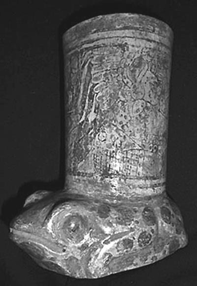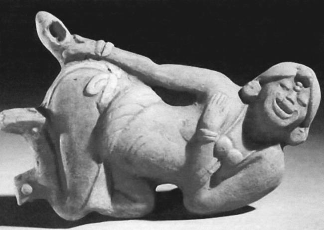 Процедура пейотовой клизмы, майанская ваза, Гватемала, классический период майя, 600 год н. э., AD 600 (вверху); пейотовая клизма, древняя терракота майя (внизу).