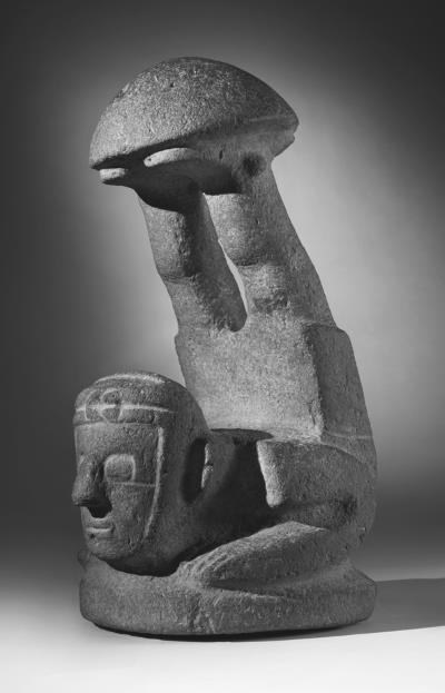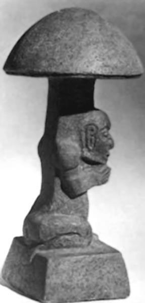 Статуи грибов доиспанского периода. Похожие скульптуры были обнаружены в Южной Мексике, Гватемале и Сан Сальвадоре, датируемые от 1000 года до н. э. до 500 года н. э. (слева). Терракоттовая скульптура с изображением празднующих танцующих вокруг статуи гриба, возможно, Мирового Древа (axis mundi). Колима, от 200 года до н. э. до 100 года н. э., Мексика (справа).