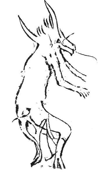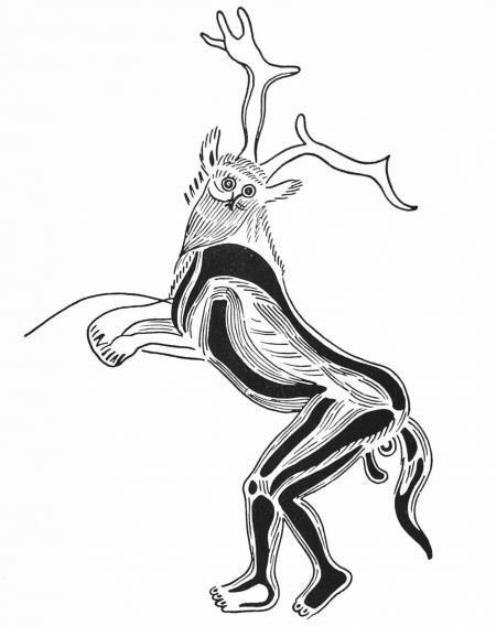 Пещерная живопись таинственной составной фигуры, сочетающей различные мужские символы: оленьи рога, глаза совы, хвост дикой лошади или волка, человеческую бороду и лапы льва (слева); «Танцор», антропоморфная фигура, возможно, танцующего шамана, из пещеры Ла-Габиллу (внизу слева; рисунок, внизу справа).