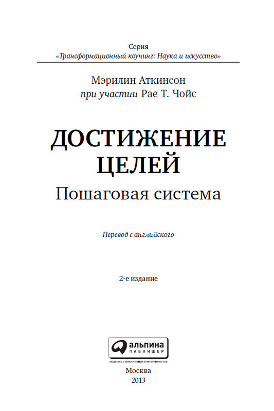 Достижение целей: Пошаговая система / Мэрилин Аткинсон, при участии Рае Т. Чойс; Пер. с англ. — 2-е изд. — М.: Альпина Паблишер, 2013. — (Серия «Трансформационный коучинг: Наука и искусство»).