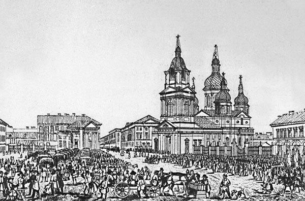 Однако вернемся к храму на Сенной. Квасов не стал делать его похожим на другие церкви эпохи барокко. Причем, не о «чистоте» стиля заботился. Зодчий «в целом художнически выразил идею кокота (птицы), прикрывающего крыльями своих птенцов». Такую высокую и точную оценку дал церкви через сто лет после ее постройки историк А. Томилин. Многие художники разных времен запечатлели облик храма, который ничто не могло затмить: ни растущие ввысь дома, ни огромные корпуса Сенного рынка, ни изменяющийся городской пейзаж. Самое важное – церковь была важнейшим звеном в системе площадей: Сенной, Никольской и Покровской. Она создавала особую духовную атмосферу, придавала площади определенный характер.