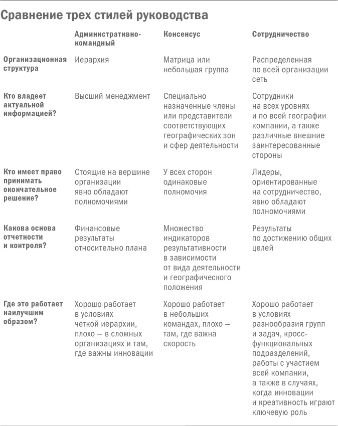 Многие руководители понимают, что для новой среды с огромным количеством взаимосвязей нужны новые правила. Для тех, кто поднялся по корпоративной лестнице в отделах, используя административно-командный стиль, могут настать трудные времена приспособления к новой реальности. Впрочем, и те менеджеры, которые пытаются руководить на основе всеобщего согласия, видят, как быстро процесс принятия решений и их исполнения заходит в тупик. Выработать правильный стиль руководства непросто.