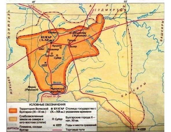 — Государство защищало от внешних неприятностей все этносы, живущие на всей территории Волжской Булгарии. Для этой цели они начали строить земляно-деревянные крепости. Так появляются первые города. На правом берегу Волги известны такие города, как Ошель (Шел), Симбир, Кан, Таябинское городище (Батыревский район), Тигашевское городище (Батыревский район) и др. На окраинах земель восточной мордвы, марийцев, удмуртов, коми-пермяков и коми-зырян были устроены сторожевые пункты (небольшие крепости).