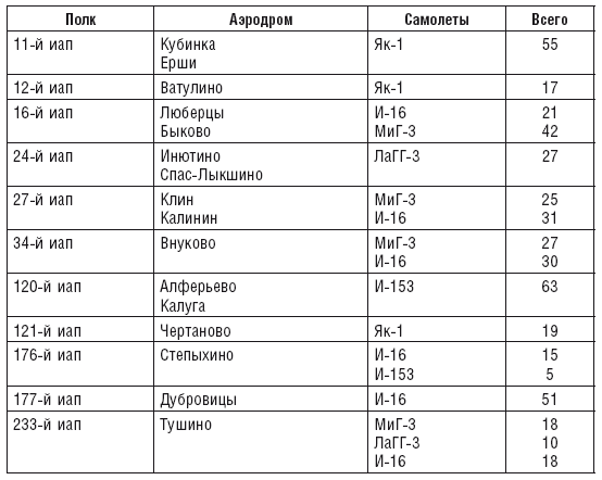 К началу июля в состав 6-го иак было передано еще 5 авиаполков. Правда, только два из них – 176-й и 177-й иап – имели матчасть – по 12 и 15 И-16 соответственно. 178, 233 и 309-й полки только еще находились в стадии формирования, причем в первом и последнем насчитывалось лишь по 5 летчиков. Зато остальные части были срочно пополнены самолетами с различных баз и авиазаводов, расположенных вокруг столицы. Истребители Як-1 и ЛаГГ-3, серийное производство которых только еще разворачивалось, поступали в корпус вне очереди. В результате уже к 1 июля парк самолетов достиг почти 400 машин (см. табл на с. 15).