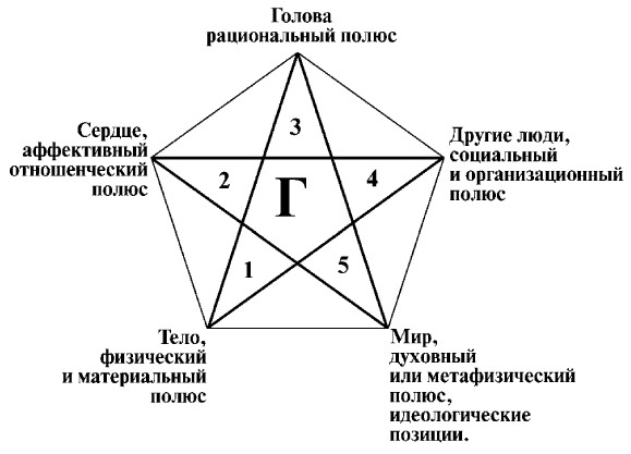 Для иллюстрации этого многомерногоподхода я часто прибегаю к символическому[5] изображению с помощью пятиконечной звезды, «пентаграммы», традиционного образа человека: – с головой, двумя руками и двумя ногами.