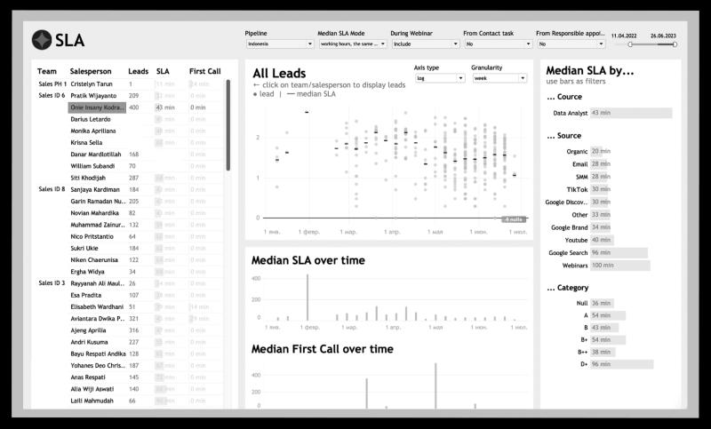 Наша команда настроила сбор и обработку данных, а также сверстала дашборд. На нем отображалась шкала со скоростью ответа, можно было настроить фильтры по источникам лидов или по отдельным продажникам.