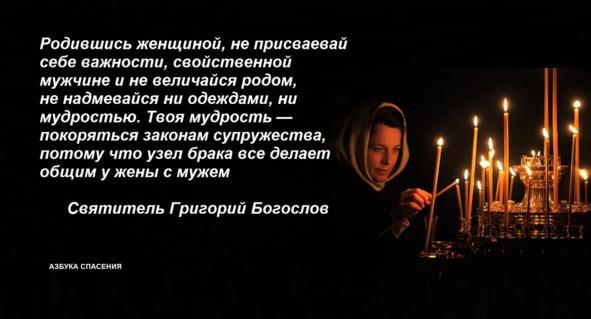 В Евангелии сказано, что Господь накормил в пустыне пять тысяч человек — кроме жен и детей (Мф. 14:21). Жена должна знать, почему она создана, знать свое назначение. Она есть помощница мужа, должна воспитывать детей в страхе Божием. Те христианские жены, которые понимают это назначение, есть добрые матери, сестры, жены. И блаженны те, которые признают это и не стремятся к тому, чего не дано им от Бога — быть главой над мужем.
