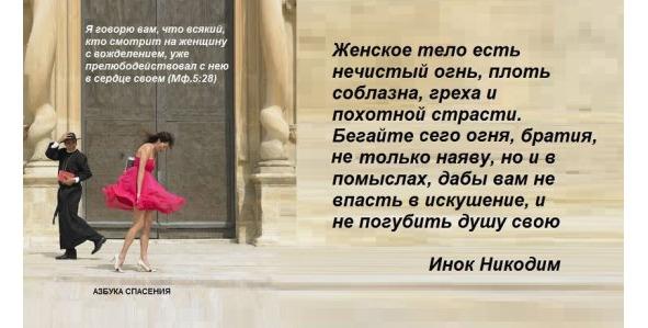 Все, что руки Твои создали, Господи, чисто, прекрасно, благопотребно, неблазненно, удобно к употреблению и действию, преднамеренному в мыслях Творца и Зиждителя и Бога нашего, особенно же тело человека — мужчины и женщины, этот дивно прекрасный и чистый храм Божества. Не знаете ли, что тела ваши суть храм живущего в вас Святаго Духа, Которого имеете вы от Бога, и вы не свои? (1Кор.6:19). Разве не знаете, что вы храм Божий, и Дух Божий живет в вас? (1Кор.3:16). Отчего же человеку представляется оно соблазнительным поводом и возбуждением ко греху, особенно тело женщины — этот одушевленный, прекрасный храм, — в которой премудростью Творца зачинается и созидается истинно предивный, премудрый и прекрасный организм человеческого тела, которой все мы обязаны жизнью и нашим телесным храмом, в котором живет бессмертная, разумная душа наша, которая должна вечно славить Творца, дарующего нам бытие разумное и показавшего нам мир Свой — небо и землю со всем, что на них есть, к славе Имени Его Святого, через которую мы делаем столь много полезного, необходимого и прекрасного в общежитии!