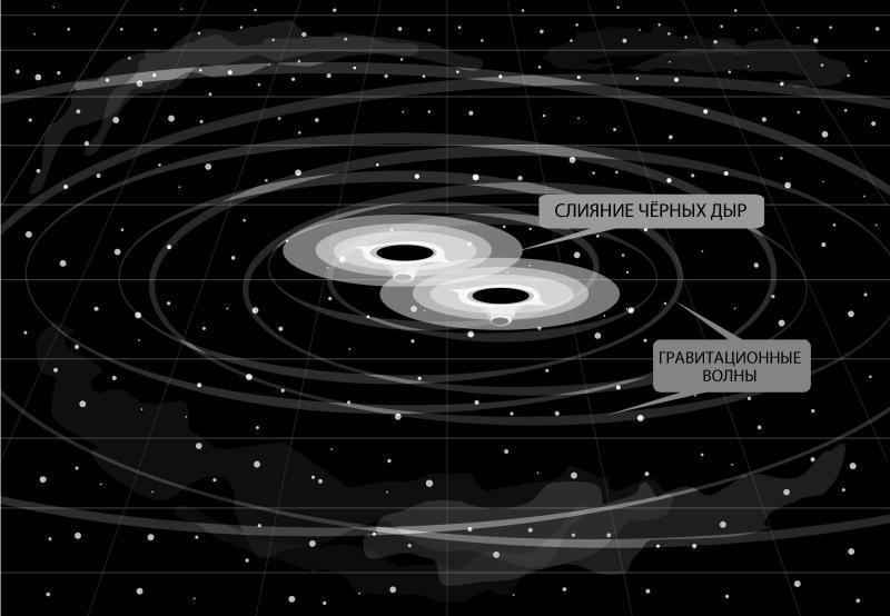 Слияние двух черных дыр и образование гравитационных волн на схеме