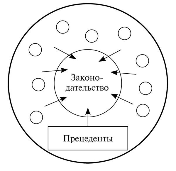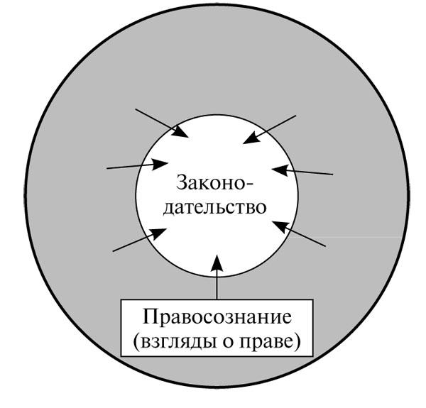 Схематично право, согласно этой концепции, можно изобразить в виде большого круга, внутри которого находится круг поменьше, символизирующий законодательство. Все, что не относится к законодательству, есть правосознание, т. е. система взглядов о справедливом и несправедливом.