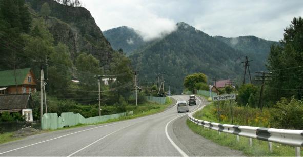 Вначале от Горно-Алтайска дорога идёт вдоль реки Катунь, а потом после местечка Усть-Муны (фото 2) переходит на другой берег Катуни и уходит вдоль реки Сема (фото 3) к Семинскому перевалу высотой 1717 м. Вид в окрестностях перевала на фото 4