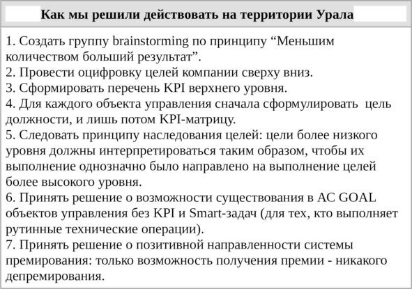 — во-первых, включить уральский дивизион в единую систему управления по целям. Создать принципиально новые цели, KPI и матрицы объектов, отличные от Волги;