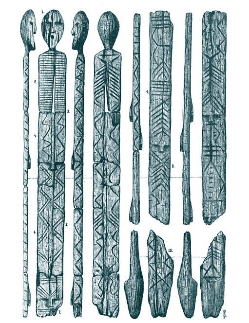 Настоящие языческие идолы обнаружили археологи при раскопках уральских торфяников, где дерево хорошо сохраняется. Один такой идол был найден в Шигирском торфянике и представлял собой фигуру из лиственницы высотой 5,3 метра, увенчанную остроконечной головой. Другой идол — из Горбуновского торфяника — менее схематичен: он также вырезан из соснового ствола, скульптор снабдил его ногами, но вот рук у него нет. Что-то подобное есть в верованиях ближайших угорских народов — хантов и манси: в их мифах рассказывается о лесных великанах менквах, неудачном творении бога Нуми-Торума, — он хотел сделать людей из лиственницы, но те превратились в «недоделанных» лесных чудовищ. Сходные изображения были найдены в торфяниках другой окраины финно-угорского мира, в Прибалтике, но они относятся к мелкой пластике, а не к монументальной скульптуре.
