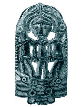 Пластина прорезная — антропоморфная фигура в окружении человеколосей. VIII–IX вв. Бронза, литье. 9,2 x 4,7 см. ЧКМ №955/57.
