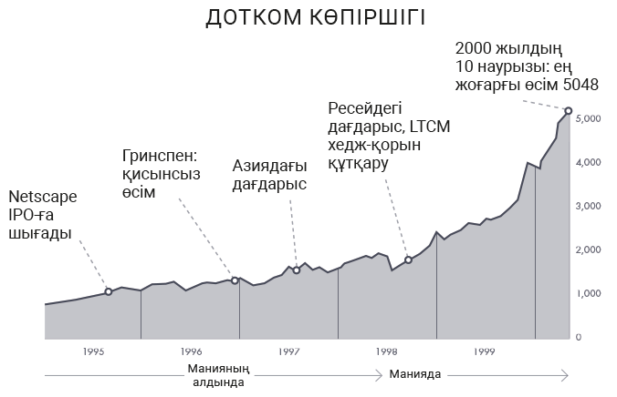 Интернет бұл көзқарасты түбегейлі өзгертті. 1993 жылдың сәуір айында әлемге Mosaic браузері ұсынылып, барлығына Интернетті қолдануға және оған кіруге жол ашты. Көп ұзамай Mosaic Netscape болып өзгертілді. Нәтижесінде, Netscape 1994 жылдың соңында Navigator браузерін шығарды. Ол аз уақытта бұрын-соңды болмаған үлкен танымалдылыққа кенелді. Егер 1995 жылдың қаңтарында ол интернет-браузер нарығының шамамен 20%-ын алып жатса, жыл өткен соң көрсеткіш 80%-ға жетті. Осындай қарқынды өсудің арқасында Netscape 1995 жылдың тамызында компанияның осы уақытқа дейін жеткілікті табысқа жете алмағанына қарамастан, нарыққа IPO ұсына алды. Келесі бес айда Netscape құны бір акция үшін 28 доллардан 174 долларға дейін өсті. Басқа жоғары технологиялық компаниялар да осындай жылдам өсу көрсеткішін көрсетті. Yahoo! 1996 жылдың сәуірінде қор нарығына шығып, акцияларды сатудан 848 миллион доллар табыс тапты. Amazon 1997 жылдың мамыр айында нарықтық құны 438 миллион долларды құрады. 1998 жылдың көктеміне қарай өз қағаздарын жариялаған жоғары технологиялық компаниялардың әрқайсысының акцияларының құны кемінде төрт есеге өсті. Күмәнданушы топтар мынандай сұрақтың жауабын табуға тырысты: Бұл компаниялардың кірісі Интернет секторына жатпайтын фирмаларға қарағанда анағұрлым жылдам өсіп жатыр ма? Оның жауабы ретінде «нарық есінен адасты» деп қорытындылай салу әлдеқайда жеңіл болды.