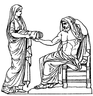 Прекрасна великая Гера, волоокая, лилейнорукая, из-под венца ее ниспадают волной дивные кудри, властью и спокойным величием горят ее очи. Боги чтут Геру, чтит ее и муж, тучегонитель Зевс, и часто советуется с ней. Но нередки и ссоры между Зевсом и Герой. Часто возражает Гера Зевсу и спорит с ним на советах богов. Тогда гневается громовержец и грозит своей жене наказаниями. Умолкает тогда Гера и сдерживает гнев. Она помнит, как подверг ее Зевс бичеванию, как сковал золотыми цепями и повесил между землей и небом, привязав к ее ногам две тяжелые наковальни.