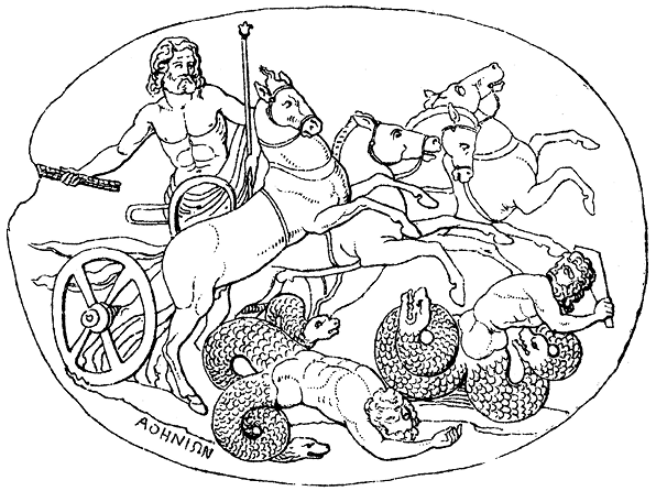 Борьба Зевса с Тифоном. Но не окончилась этим борьба. Гея-Земля разгневалась на олимпийца Зевса за то, что он так сурово поступил с ее побежденными детьми-титанами. Она вступила в брак с мрачным Тартаром и произвела на свет ужасное стоголовое чудовище — Тифона. Громадный, с сотней драконовых голов, поднялся Тифон из недр земли. Диким воем всколебал он воздух. Лай собак, человеческие голоса, рев разъяренного быка, рыканье льва слышались в этом вое. Бурное пламя клубилось вокруг Тифона, и земля колебалась под его тяжкими шагами. Боги содрогнулись от ужаса. Но смело ринулся на него Зевс-громовержец, и загорелся бой. Опять засверкали молнии в руках Зевса, раздались раскаты грома. Земля и небесный свод сотряслись до основания. Ярким пламенем вспыхнула опять земля, как и во время борьбы с титанами. Моря кипели от одного приближения Тифона. Сотнями сыпались огненные стрелы-молнии громовержца Зевса; казалось, что от их огня горит самый воздух и горят темные грозовые тучи. Зевс испепелил Тифону все его сто голов. Рухнул Тифон на землю; от тела его исходил такой жар, что плавилось все кругом. Зевс поднял тело Тифона и низверг в мрачный Тартар, породивший его. Но и в Тартаре грозит еще Тифон богам и всему живому. Он вызывает бури и извержения; он породил с Ехидной, полуженщиной-полузмеей, ужасного двуглавого пса Орфа, адского пса Кербера, лернейскую гидру и Химеру; часто колеблет Тифон землю.