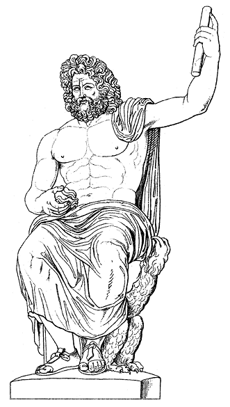 С Олимпа рассылает людям Зевс свои дары и утверждает на земле порядок и законы. В руках Зевса судьба людей; счастье и несчастье, добро и зло, жизнь и смерть — все в его руках. Два больших сосуда стоят у врат дворца Зевса. В одном сосуде дары добра, в другом — зла. Зевс черпает в них добро и зло и посылает людям. Горе тому человеку, которому громовержец черпает дары только из сосуда со злом. Горе и тому, кто нарушает установленный Зевсом порядок на земле и не соблюдает его законов. Грозно сдвинет сын Крона свои густые брови, черные тучи заволокут тогда небо. Разгневается великий Зевс, и страшно подымутся волосы на голове его, глаза загорятся нестерпимым блеском; взмахнет он своей десницей — удары грома раскатятся по всему небу, сверкнет пламенная молния и сотрясется высокий Олимп.