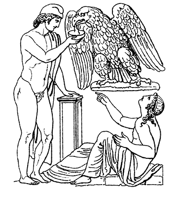 Пируют боги. Дочь Зевса, юная Геба, и сын царя Трои, Ганимед, любимец Зевса, получивший от него бессмертие, подносят им амврозию и нектар — пищу и напиток богов. Прекрасные хариты [10] и музы услаждают их пением и танцами. Взявшись за руки, водят они хороводы, а боги любуются их легкими движениями и дивной, вечно юной красотой. Веселее становится пир олимпийцев. На этих пирах решают боги все дела, на них определяют они судьбу мира и людей.