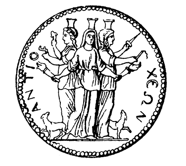 Зевс хранит порядок и правду в мире и посылает людям счастье и горе. Но хотя посылает людям счастье и несчастье Зевс, все же судьбу людей определяют неумолимые богини судьбы — мойры [11], живущие на светлом Олимпе. Судьба самого Зевса в их руках. Властвует рок над смертными и над богами. Никому не уйти от велений неумолимого рока. Нет такой силы, такой власти, которая могла бы изменить хоть что-нибудь в том, что предназначено богам и смертным. Лишь смиренно склониться можно перед роком и подчиниться ему. Одни мойры знают веления рока. Мойра Клото прядет жизненную нить человека, определяя срок его жизни. Оборвется нить, и кончится жизнь. Мойра Лахесис вынимает, не глядя, жребий, который выпадает человеку в жизни. Никто не в силах изменить определенной мойрами судьбы, так как третья мойра, Атропос, все, что назначили в жизни человеку ее сестры, заносит в длинный свиток, а что занесено в свиток судьбы, то неизбежно. Неумолимы великие, суровые мойры.