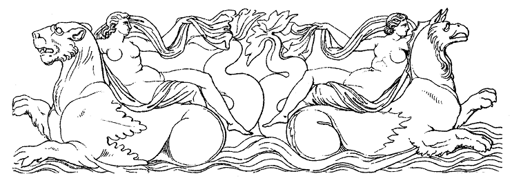 С тех пор живет Амфитрита с мужем своим Посейдоном в подводном дворце. Высоко над дворцом шумят морские волны. Сонм морских божеств окружает Посейдона, послушный его воле. Среди них — сын Посейдона Тритон, громовым звуком своей трубы из раковины вызывающий грозные бури. Среди божеств — и прекрасные сестры Амфитриты, нереиды. Посейдон властвует над морем. Когда он на своей колеснице, запряженной дивными конями, мчится по морю, тогда расступаются вечно шумящие волны и дают дорогу повелителю Посейдону. Равный красотой самому Зевсу, быстро несется он по безбрежному морю, а вокруг него играют дельфины, рыбы выплывают из морской глубины и теснятся вокруг его колесницы. Когда же взмахнет Посейдон своим грозным трезубцем, тогда, словно горы, вздымаются морские волны, покрытые белыми гребнями пены, и бушует на море свирепая буря. Бьются тогда с шумом морские валы о прибрежные скалы и колеблют землю. Но простирает Посейдон свой трезубец над волнами, и они успокаиваются. Стихает буря, снова спокойно море, ровно, как зеркало, и чуть слышно плещется у берега — синее, беспредельное.