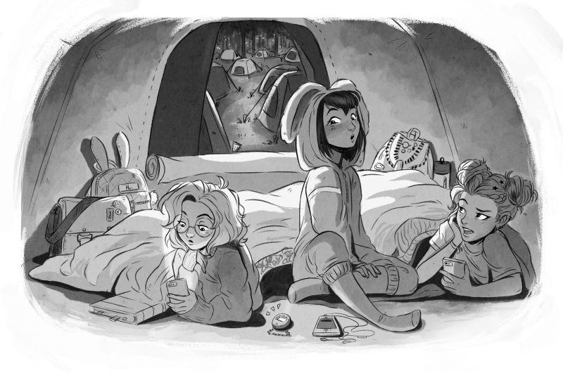 Ирис вешает на шею камеру. С такими камерами нужно обходиться предельно осторожно: они могут сломаться от одного неловкого движения, потому Хана старается держаться от нее как можно дальше (насколько это позволяет палатка), в то время как подруга набрасывает на плечи поверх пижамы огромную джинсовую куртку.