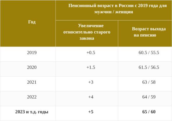 Изменения будут происходить поэтапно — пенсионный возраст будет повышаться с 2019 года ежегодно на 1 год, кроме первых двух лет, когда будут действовать льготные условия по выходу на пенсию — на 6 месяцев раньше срока, установленного новым законом. Окончательные значения для мужчин и женщин (соответственно 65 и 60 лет) будут установлены с 2023 года. Эти изменения в законе можно проиллюстрировать следующей таблицей: