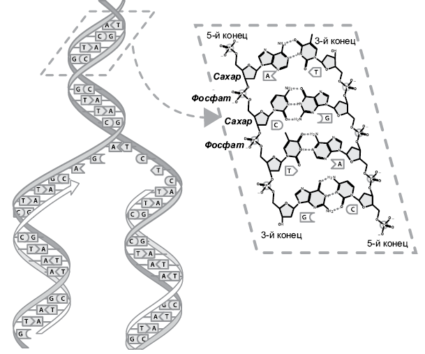 Когда Уотсон экспериментировал с картонными шаблонами азотистых оснований, его осенила блестящая идея: он осознал, что аденин (A) из одной спирали может образовывать химическую связь (пару) только с тимином (T) из другой спирали, тогда как гуанин (G) из одной спирали аналогичным образом соединяется с цитозином (C) из другой. Контуры любой пары оснований, будь то АТ или GC, примерно одинаковы, причем форма одной спирали задает форму другой, а порядок оснований в одной спирали зависит от порядка оснований в другой. При делении клетки двойная спираль расплетается, и каждая половина содержит достаточную информацию, чтобы послужить шаблоном для новой спирали. В результате из одной молекулы ДНК получаются две, то есть гены самовоспроизводятся, передавая наследственные признаки из поколения в поколение.