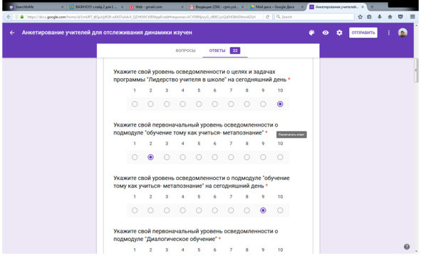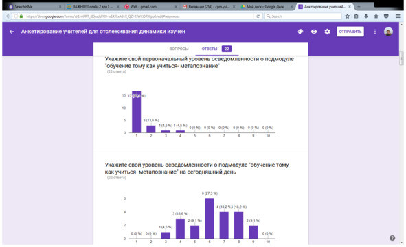 Из рисунка 2 видно, что учителя планируют пошаговые действия в дальнейшем усвоении сектора «Обучение тому, как учиться, или Метакогнитивные навыки». Таким образом, каждый учитель группы благодаря представленным инструментам мог формировать свою собственную траекторию развития и самосовершенстовования. Однако мне, как тренеру, этого было недостаточно: чтобы отслеживать динамику усвоения модулей всей группы в целом, необходимо было продумать и найти другие способы. Это в свою очередь способствовало созданию опросников в Google Формах через формулировку вопросов по шкале на начало и конец изучения модулей (рис. 3).