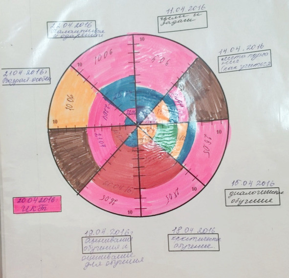 Обучение на первом модуле программы «Наука и искусство трансформационного коучинга» в феврале 2016 года позволило мне в деталях продумать, как именно «Колесо баланса» и «Четыре вопроса планирования» помогут не только осуществить мониторинг усвоения учителями программы «Лидерство учителя в школе», но и сформировать индивидуальную траекторию развития каждого учителя. Для этого необходимо было пересмотреть всю программу «Лидерство учителя в школе» и выстроить процесс обучения через разработку так называемых листов самооценивания, основанных на коучинговом инструменте «Колесо баланса». Таким образом, каждый сектор «Колеса» представлял собой один из модулей программы, шкалы которого очень подробно и детально описывали каждую отметку в динамике наращивания информации: от уровня знаний к уровню практического применения и оценивания.