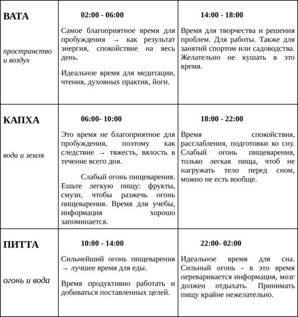 Доши оказывают на нас свое постоянное влияние с шагом в четыре часа, в течение всех 24 часов в сутки. Каждые четыре часа преобладает одна доша и оказывает влияние на общее состояние. Другими словами, есть время ваты, питты и капхи, как днем, так и ночью. Понимание этого позволяет вам выбирать занятия, пищу, которые будут поддерживать доминирующую энергию внутри и вокруг вас в это время.
