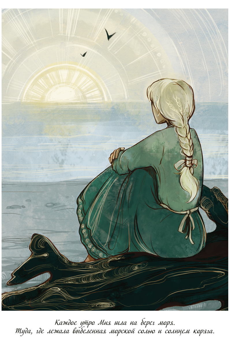 Здесь, на чердаке, она садилась в уголок, зажигала толстую-претолстую свечу, которую стащила однажды у Буна в лавке, и открывала сундук. Это был маленький старый сундук на железной защелке, Мия нашла его на чердаке случайно, прошлой весной. И чего в нем только не было! Две огромные ракушки (таких на их берегу не встретишь), маленький звонкий колокольчик, коробка с почти закончившимися акварельными красками и две кисточки, стеклянный голубой шарик, плюшевая собака с оторванным ухом, толстый красный карандаш, трубка, почерневшая от табака… Но самое главное — книга. Старая, разбухшая от частого чтения, с выцветшими картинками и — на другом языке. На языке, которого Мия не знала.