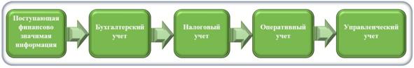 Как показано на Рисунке 1, изначально финансово значимая информация становится предметом бухгалтерского учета организации и применяется при систематизации доходных и расходных статей, составляющих общую и первичную информацию о финансовом состоянии хозяйствующего субъекта. Ввиду того, что каждая организация является налоговым агентом, используемая на этапе бухгалтерского учета финансово значимая информация учитывается при формировании отношений и соблюдении установленных законодательством обязательств перед государством в рамках налогового учета [41]. Оперативный учет базируется на анализе ключевых показателей финансовых результатов при прогнозировании краткосрочного будущего хозяйствующего субъекта. Этап управленческого учета в хозяйственной деятельности организации наступает в момент формирования целесообразности прогнозируемого будущего в среднесрочной и долгосрочной перспективе, затрагивающего все направления деятельности и структурные подразделения хозяйствующего субъекта.