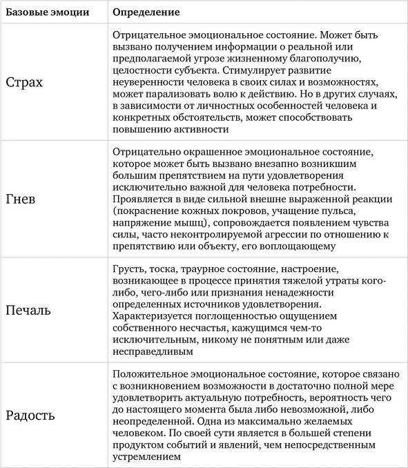 До некоторого времени считалось, что у человека шесть базовых эмоций: страх, гнев, печаль, радость, а также удивление и отвращение. Однако по последним исследованиям Института нейронаук и психологии Глазго, базовых эмоций не шесть, а четыре. Ученые сравнили базовые выражения лиц людей, переживающих весь спектр эмоций, и пришли к выводу, что выражение лица при удивлении схоже с выражением лица при страхе, а выражение лица при отвращении такое же, как и при гневе.1 Поэтому базовыми эмоциями, имеющими биологическую основу, по последним исследованиям считаются именно страх, гнев, печаль и радость.