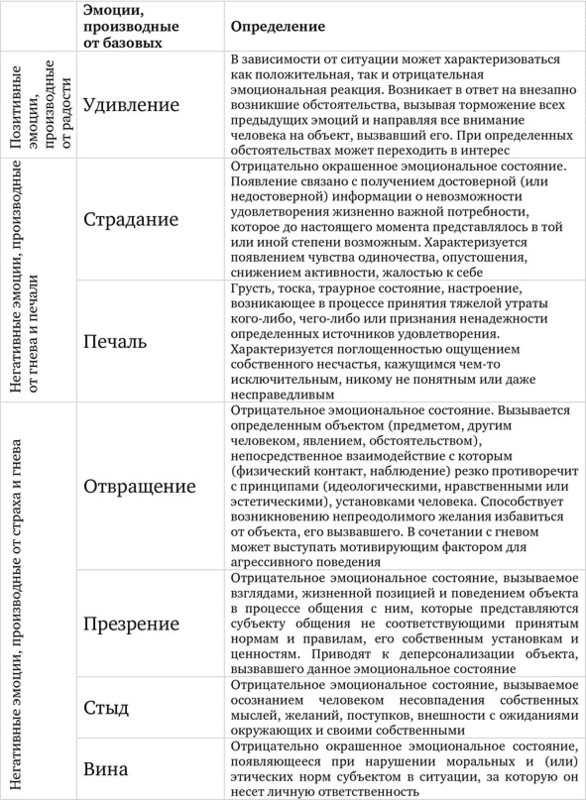 Страх, гнев, печаль и радость – основные эмоции человека. А как же стыд, вина, интерес и другие чувства и эмоции, спросите вы. На четырех базовых эмоциях наш спектр эмоциональной жизни не заканчивается. Все остальные эмоции – производные от четырех основных. Определение, а точнее определения базовых эмоций приведены в первой таблице, основные производные – во второй таблице.