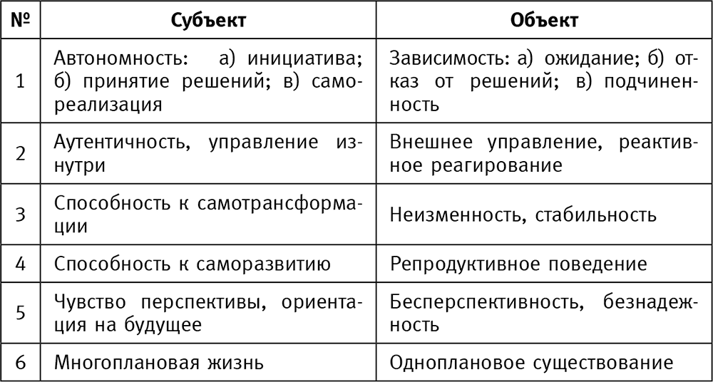Для дальнейшего изложения необходимо расширить теоретическое понимание человека как субъекта в его противопоставлении человеку-объекту. Уже было сказано, что индивид может переходить из одного состояния в другое, но в ряде случаев его состояние устойчиво фиксировано в позиции объекта, а освобождение может прийти только при использовании ресурсов позиции человека-субъекта. Укажем следующие шесть отличий человека в позиции субъекта от человека в позиции объекта, что существенно прояснит суть консультативной работы.