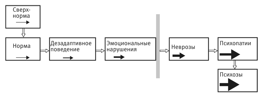 Схема, представленная на рис. 2, отражает нашу попытку предложить некоторую «периодическую таблицу» психологических проблем, включая так называемые заболевания. Зачерненная стрелка внутри каждого прямоугольника является условным обозначением силы связанной эмоциональной энергии. Вертикальная черта отделяет зону психического здоровья (слева) от зоны «болезни» (справа), хотя мы считаем, что эта граница во многом условна. Белые стрелки, соединяющие прямоугольники, соответствующие уровням проблем, не означают того, что индивид постепенно переходит с одного уровня на другой, они подчеркивают то, что все уровни выстроены в единый ряд, от максимального проявления субъектности до все более глубокого и системного ее разрушения.