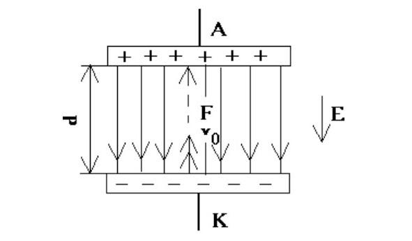Майдон кучланганлиги мусбат бирлик зарядга таъсир этувчи кучга тенг бўлади. Шунинг учун битта электронга таъсир этувчи куч бўлади: