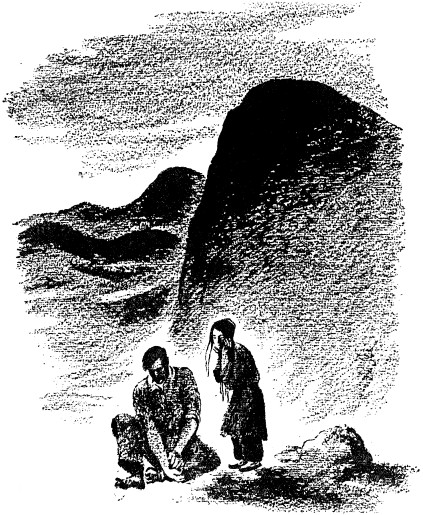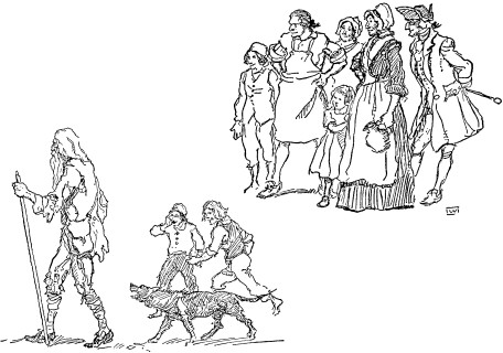 У него была собака по имени Волк. И вот однажды, чтобы избавиться от работы на ферме, Рип взял ружье и отправился вместе с Волком бродить по лесам. Забрался далеко. И вдруг слышит окрик: «Рип ван Винкль! Рип ван Винкль!» А его Волк тут же «ощетинился, зарычал, прижался к хозяину и замер...» И вот Рип видит странного незнакомца «с густою гривою волос и седой бородой. Одет он был по старинной голландской моде: в суконный камзол, перетянутый у пояса ремнем, и несколько пар штанов, причем верхние, необыкновенно широкие, были украшены сбоку и рядами пуговиц, а у колен – бантами. Он тащил на плече изрядный бочонок, очевидно наполненный водкой, и подавал Рипу знаки, прося его приблизиться и помочь».